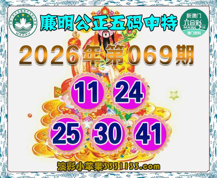 069期:〖廉明公正〗 五码中特【11.24.25.30.41】开:24